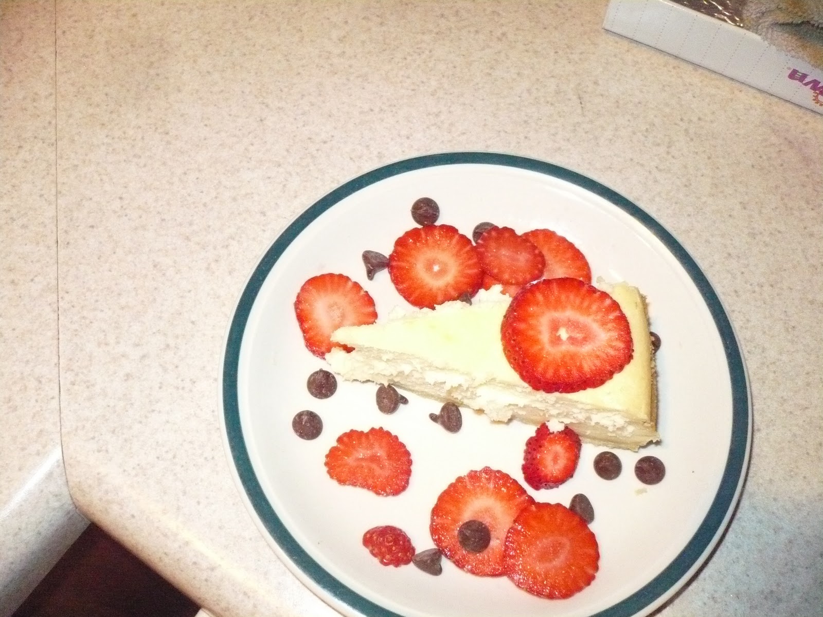 When everyone was finished eating, I cleared away their dishes and had the kids sit at the table and continue their conversations. Time to move on to dessert! For our Valentine's dessert I homemade a New York Style white chocolate cheesecake and garnished it with fresh strawberries and chocolate chips. WOW! It was so much better than it looks in the picture! Super creamy and rich. A definite success! The kids gobbled it up and they thought it was so neat that they got their dessert right after dinner. Funny. :)